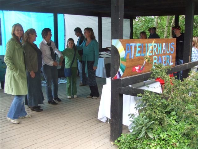 Participants of art classes represented the "Atelierhaus Baerl" (Studiohouse) with a wide range of artworks at the 7 th "Kunstcocktail" event around the Loheider See (lake) in Duisburg-Baerl. (12. + 13.05.07) Despite bad weather visitors not only showed appreciation for their works but voted with almost 100 % for the preservation of the municipal building by giving their signature or by even becoming new members of the Initiative (IEAB).